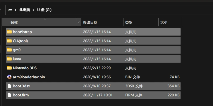 - 你的内存卡根目录应该至少包括一个arm9loaderhax.bin文件,此教程才可以继续。如果没有,请尝试通过此教程放置一个到根目录。