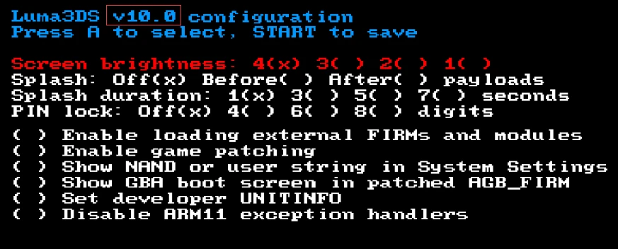 请按住SELECT键 (注意是SELECT键!SELECT键!SELECT键!!!不要按成START键进了Luma3DS chainloader或者什么奇怪的东西还一脸困惑到处发帖!!!),然后按下电源键开机以打开Luma3DS,然后注意观察当前版本号: