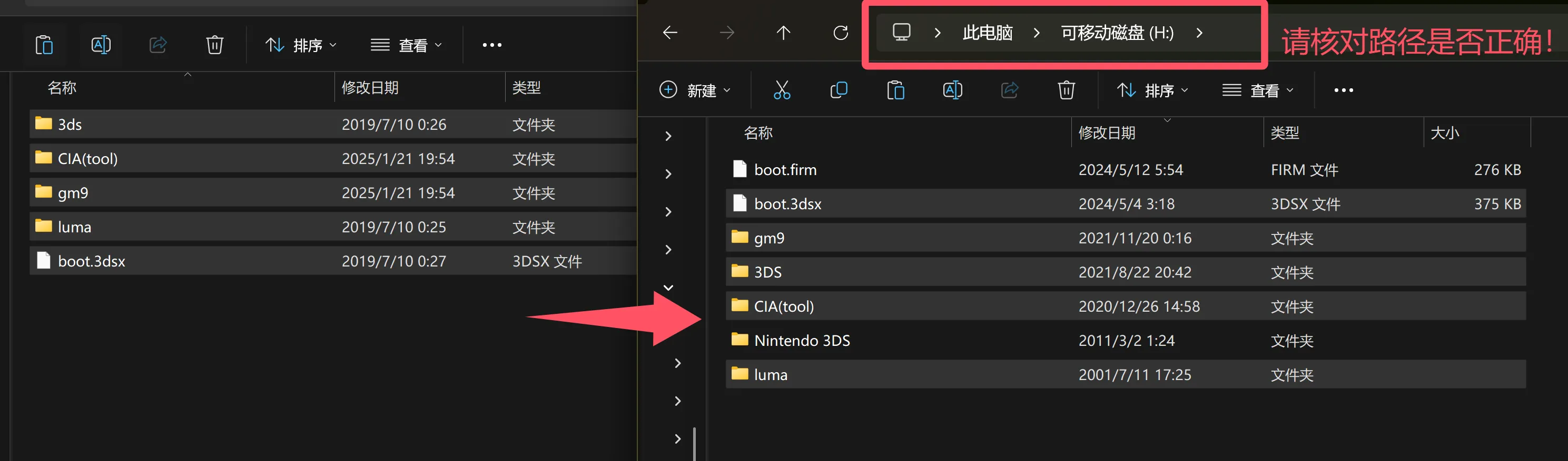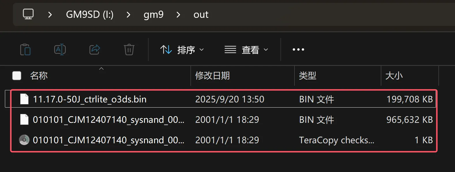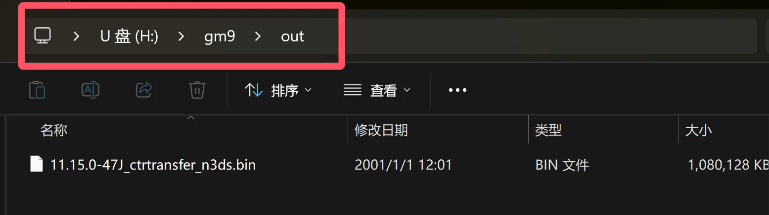 将上文压缩包中的 .bin 文件(压缩包内最大的那个文件) 复制到 SD 卡 /gm9/out/ 目录下。