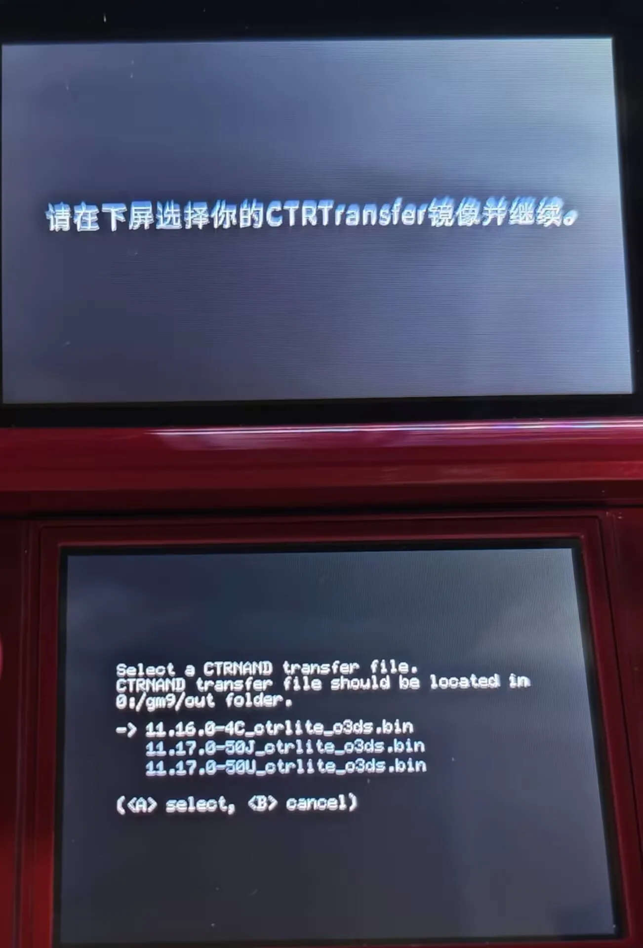 - 请注意,如果没有 ctrtransfer 这个选项,请检查上文中是否将 ctrbasefile.zip 解压到内存卡的根目录,以及内存卡的根目录中是否有 boot.firm(若没有,请按这个补回一个)