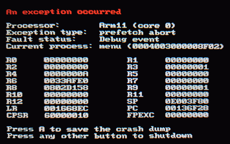 Process name: nwm | 你的主机的网卡硬件可能坏了。如果你的3DS是老型号的,则其独立网卡从主板上脱落也是有可能的。 尝试关闭Wifi功能以规避错误,若是老型号的3DS,则或许可以尝试拆机将网卡重新安上再看看主机情况。 |