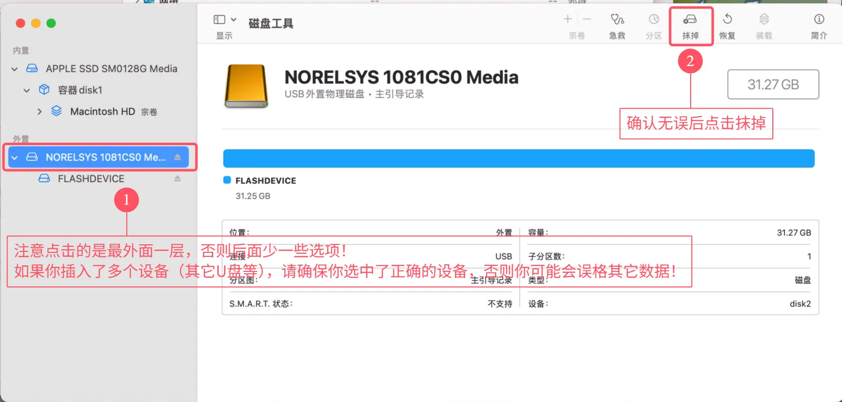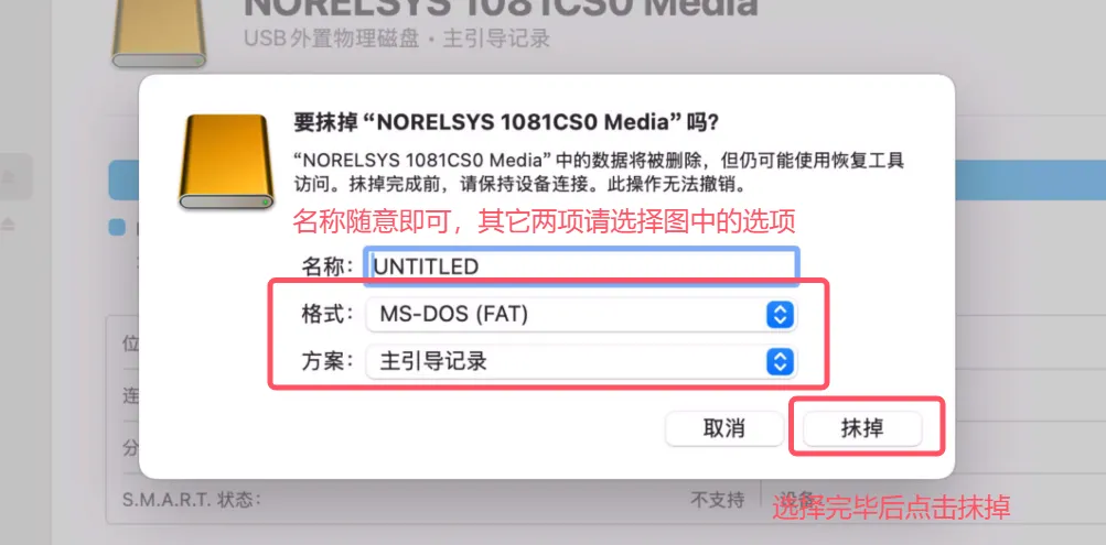 - 确保格式选择为 MS-DOS(FAT),方案为“主引导记录”,然后点击抹掉: