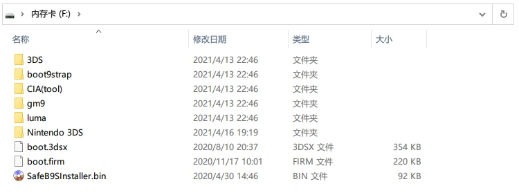 放好后你的内存卡根目录应该至少要有这些文件: