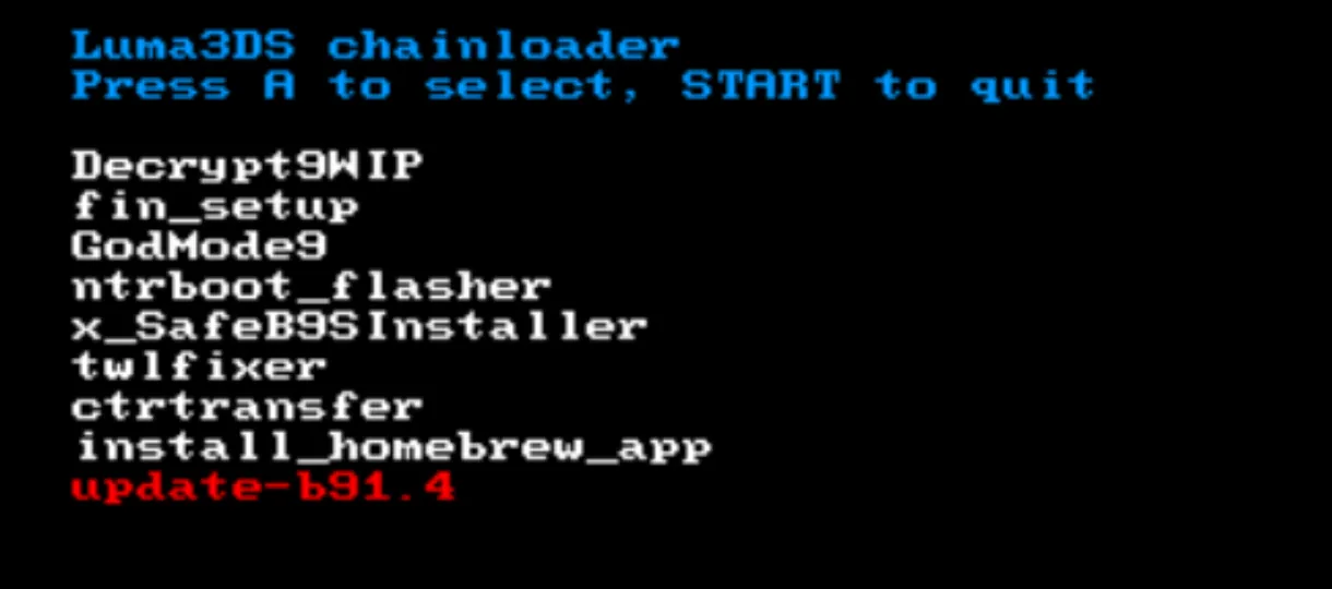 - 按住START+电源键开机进入Luma3DS Chainloader菜单,将红色光标移动至update-b91.4后按A键。